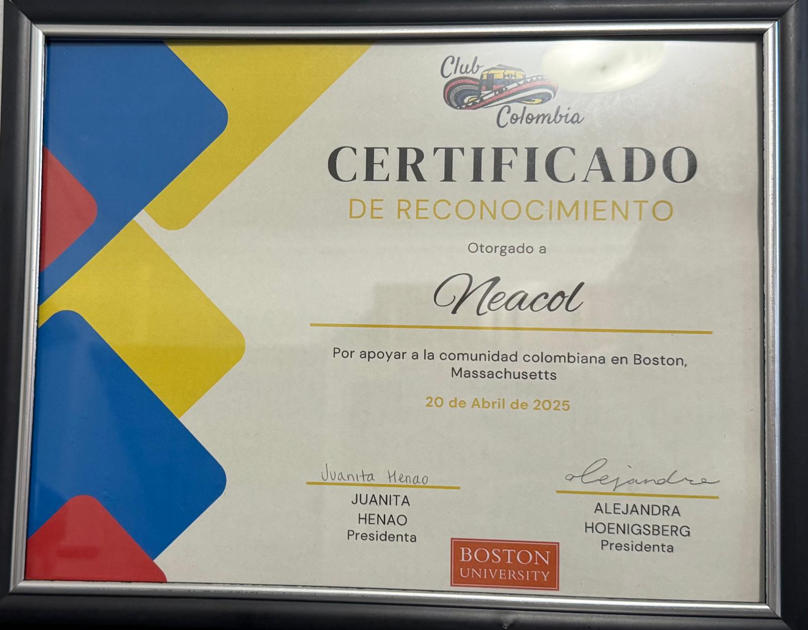 On Sunday, April 20, NEACOL was honored with a Recognition Award by Club Colombia, a student organization at Boston University, during their "Viva Colombia 2025" celebration. This award highlights NEACOL’s ongoing commitment to supporting and promoting Colombian values in Massachusetts. |